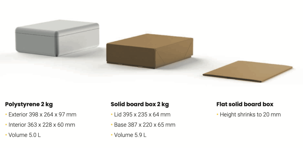 EPS boxes (Expanded Polystyrene boxes) are commonly used to package and transport temperature-sensitive goods such as fish, seafood and meat. Solidus provides an innovative, sustainable alternative to these EPS boxes: solid board packaging.
